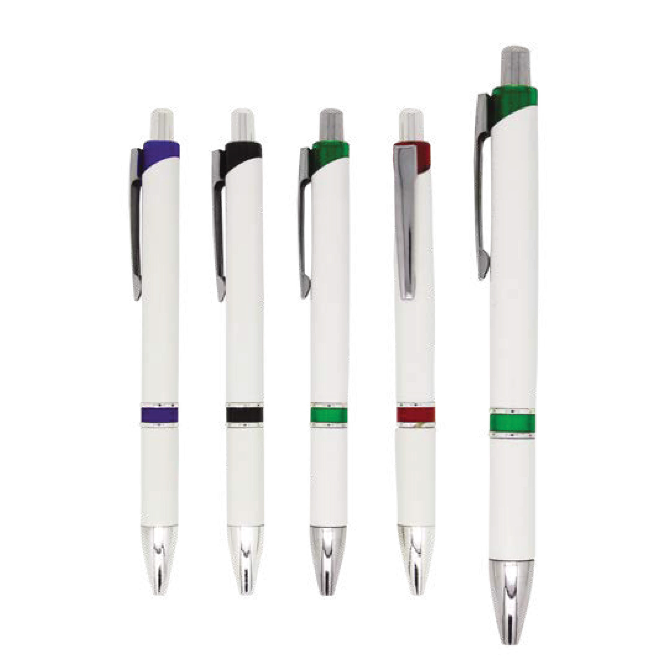 Retractable plastic ballpoint pen with a white barrel, white trim, and colored accent ring. Smooth-writing medium point, lightweight and ideal for everyday use, events, and promotional branding.