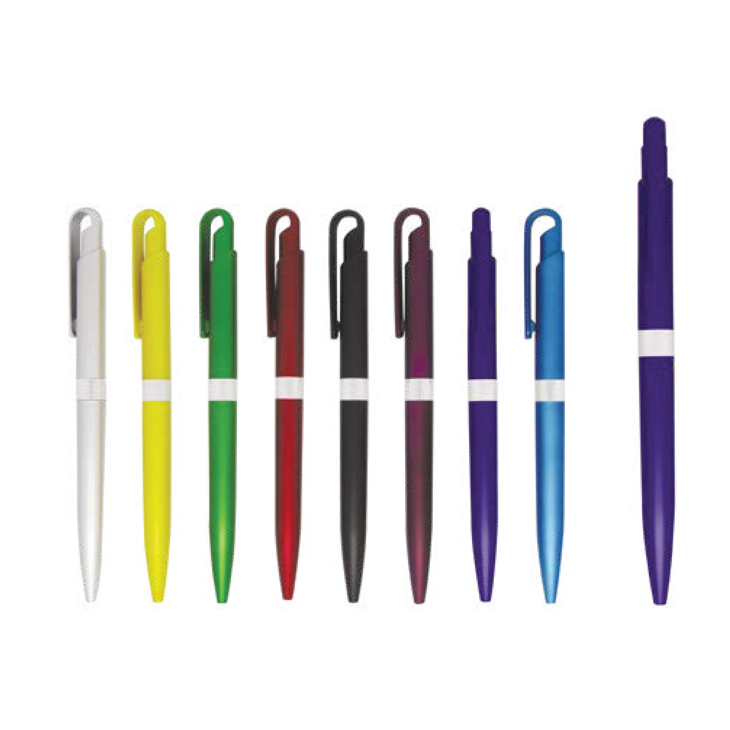 A slim retractable pen featuring a clean modern silhouette and a contrasting accent band. Designed with a smooth plastic barrel and minimalist clip, available in both full-color and white-body variations for versatile promotional branding.